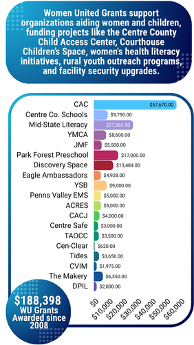 A key activity for Women United is the annual grant program which funds local 501(c)3 organizations implementing new or expanding projects, programs, or services that support women and children in Centre County. Since 2008, Women United has provided over $183,000 to local organizations for start-up programs, including: