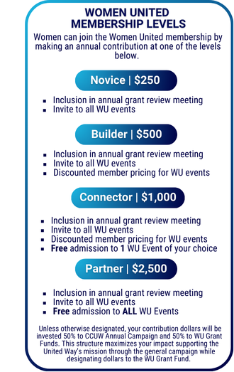 Funding for Women United grants comes from financial support of the group as a requirement of membership. Members support both the CCUW General Campaign and the Women United Grant Fund through a tiered level model of membership. Learn more about Women United membership and benefits below!